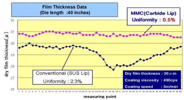 ?。?)刃口材料硬度高,耐磨損,使用壽命長。正負(fù)極漿料是由固體顆粒組成的懸浮液,在涂布過程中漿料在壓力作用下不斷從刃口狹縫噴出,固體顆粒會(huì)對刃口噴出面形成磨粒磨損,這就要求刃口材料硬度高,耐磨,能夠長期使用。