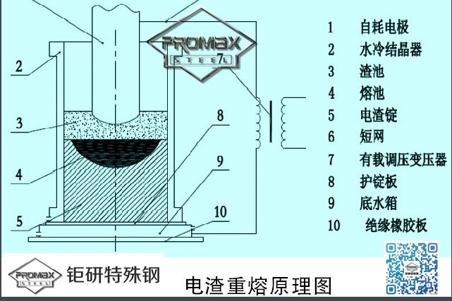 同時,液態(tài)金屬在渣池覆蓋下,基本上避免了再氧化。因為是在銅制水冷結晶器內熔化、精煉、凝固的,這就杜絕了耐火材料對鋼的污染。鋼錠凝固前,在它的上端有金屬熔池和渣池,起保溫和補縮作用,保證鋼錠的致密性。上升的渣池在結晶器內壁上形成一層薄渣殼,不僅使鋼錠表面光潔,還起絕緣和隔熱作用,使更多的熱量向下部傳導,有利于鋼錠自下而上的定向結晶。